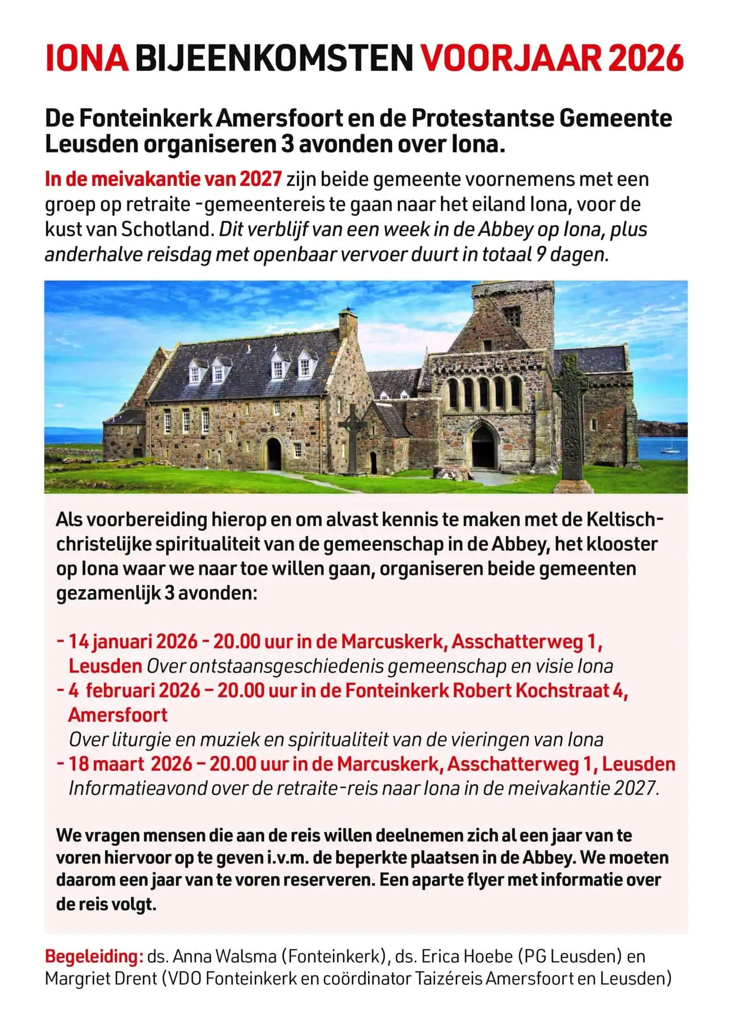 In 2027 organiseren de Fonteinkerk Amersfoort en de Protestantse Gemeente Leusden een reis naar de abdij van Iona. Ter voorbereiding hierop organiseren de kerken 3 kennismakingsavonden met Iona.